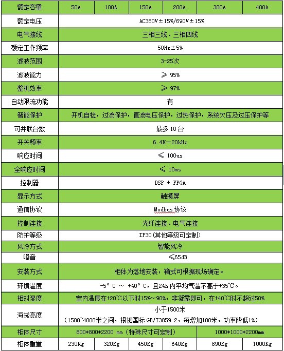 解決方案RGAF型有源濾波器采用電力電子元件,以開關(guān)頻率IGBT產(chǎn)生高次電流抵消諧波電流。設(shè)備中電子元件的過電壓、設(shè)備的發(fā)熱處理是困擾APF技術(shù)的二大瓶頸。采用3個H橋技術(shù),徹底解決了低壓APF的上述問題,榮廣電氣的APF具有以下優(yōu)點(diǎn):1. 采用諧波電流的預(yù)測控制方法,響應(yīng)速度快、濾波能力強(qiáng)、運(yùn)行損耗小??赏耆珴M足不同的工況需求;2. 能同時動態(tài)實(shí)時濾除全部諧波或多種選定的諧波;采用矢量篩選技術(shù),可對2到50次之間的諧波進(jìn)行有選擇的補(bǔ)償。3. 在濾除諧波的同時動態(tài)補(bǔ)償基波無功,提高功率因數(shù)。也可以在零無功功率的情況下濾除諧波,避免無功反送情況出現(xiàn);4. 安全性好,不存在諧振或電壓放大設(shè)計(jì)有接入電抗器,可自動限制輸出電流,裝置永不過載,保證裝置安全可靠工作;5. 可對不平衡進(jìn)行補(bǔ)償,避免負(fù)序電流對電網(wǎng)及電氣設(shè)備影響;6. 智能啟動系統(tǒng),一鍵并網(wǎng)7. 電氣部分采用H橋連接:把系統(tǒng)線電壓分解成相電壓處理,大幅提高了設(shè)備的可靠性。輸出電流波形平滑,裝置損耗低,自適應(yīng)控制算法,能適應(yīng)任何系統(tǒng)阻抗的變化。8. 3H橋式結(jié)構(gòu):每一相分別控制,提高了整個系統(tǒng)的可控性,例如當(dāng)其中一相諧波電流過高,進(jìn)行補(bǔ)償時,不會影響其他兩相的補(bǔ)償效果。同時3H橋式散熱效果好,它采用A、B、C三相分別散熱,每相電抗器與IGBT分別配有專門的散熱風(fēng)扇。配置參數(shù)